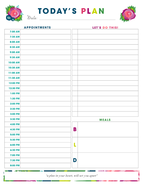 One of the tips I read while looking into the topic of time management, was to take a few minutes at the beginning of each day to make a plan of attack.  So, I included a printable for that within the kit.  I typically rely on my daily planner for this, but now I have it built in to my morning routine to look at my planner, compare it to my daily schedule, and mash them together.  It also allows me to take a few minutes to list a couple specific goals for the day.